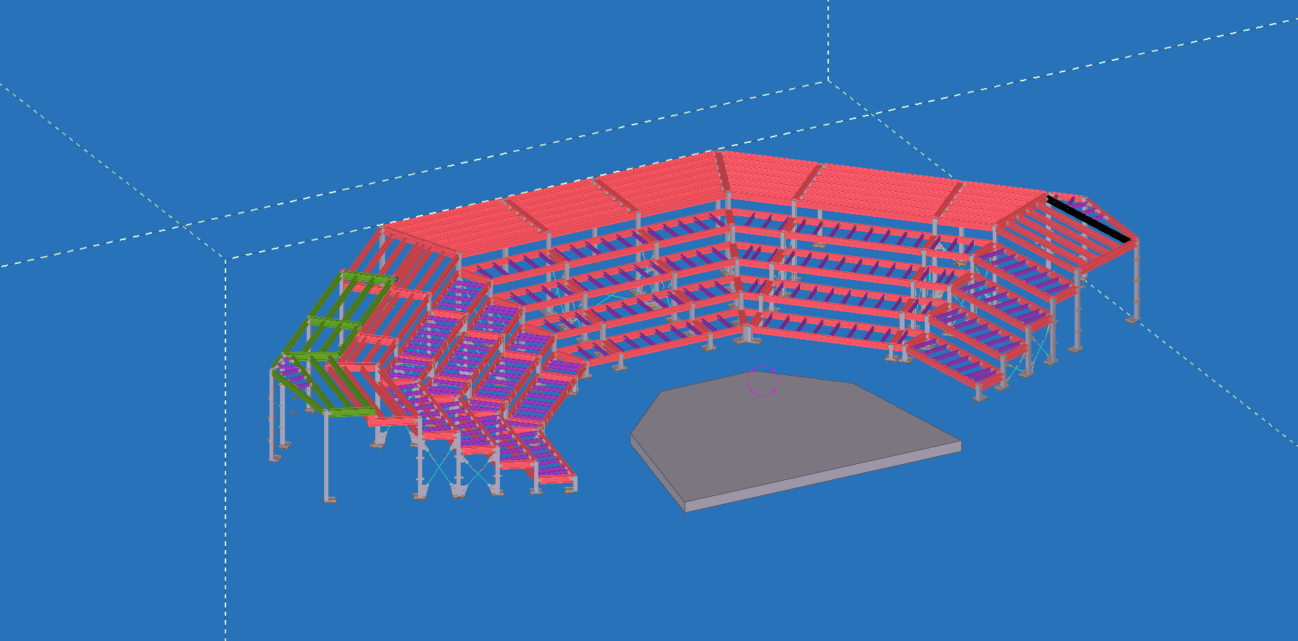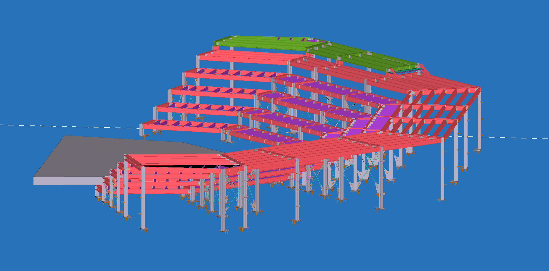 With our extensive experience with 3D BIM we were able to work within very tight on site tolerances. The tiered seating steel work had to fit in around existing concrete walls with minimal edge distances. We used in house 3D BIM to detail the workshop drawings for the structural steel. We also supplied additional stee lwork to the existing structure i.e. roof ring beam, stairs, balustrades, lintels, door frames etc.